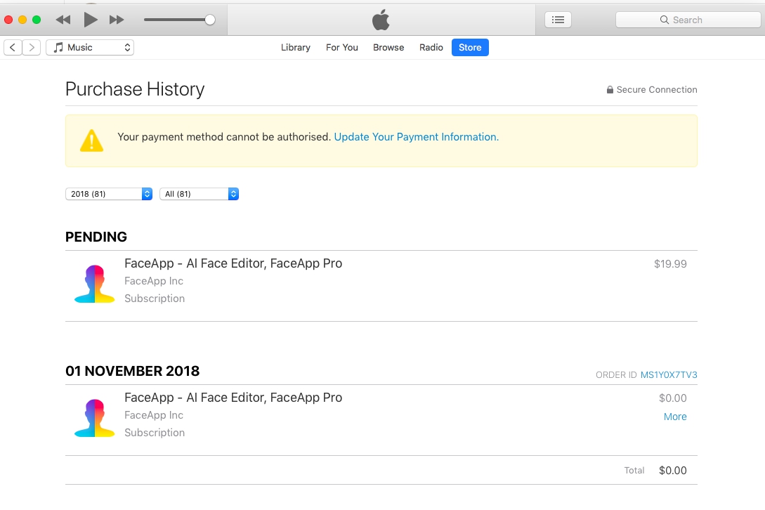 Based on the screenshot provided to you by the user the item has been transacted by the App Store as a successful transaction but the App Store is still processing the payment as a result the customer purchase history shows the transaction as pending. Go to Apples Report a Problem portal and sign in using the Apple ID used for purchase. There are two reasons for Apple iTunes billing practices.